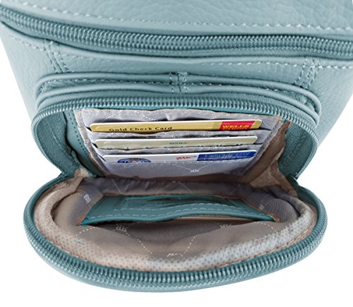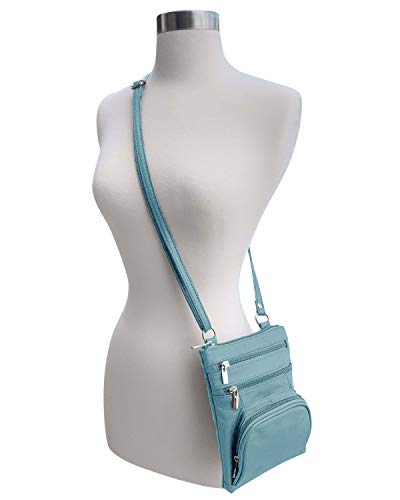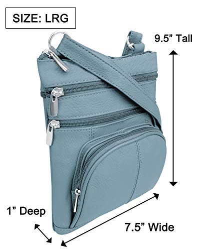 Roma Leathers' Cross Body Purse - Premium Light Blue Colored Cowhide Leather - Multi Zippered Pockets - Front Organizer Pocket With Credit Card Slots - Adjustable Shoulder Strap - Designed in U.S.A.