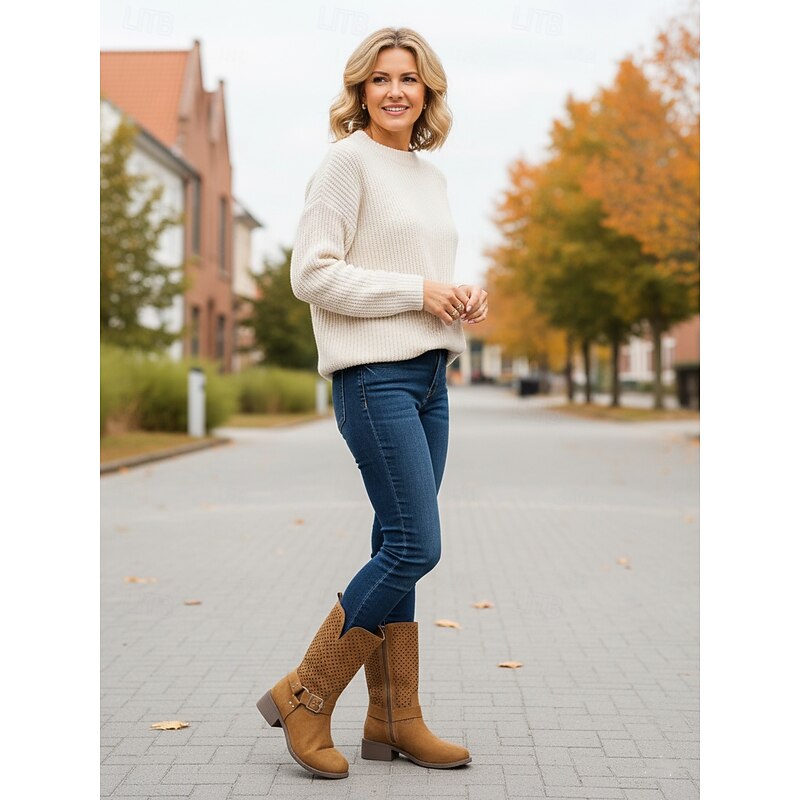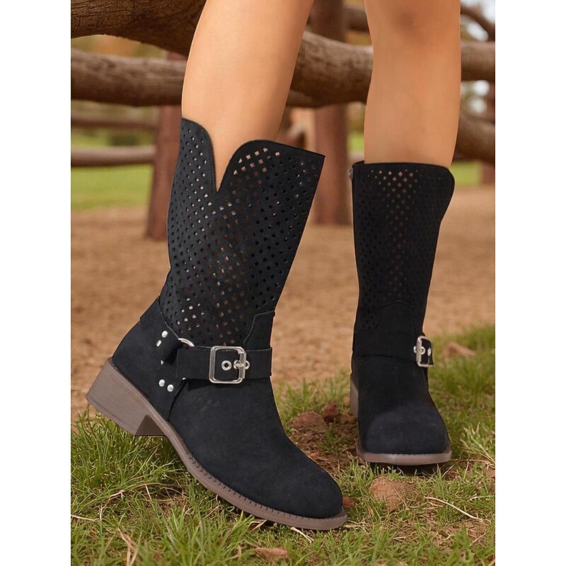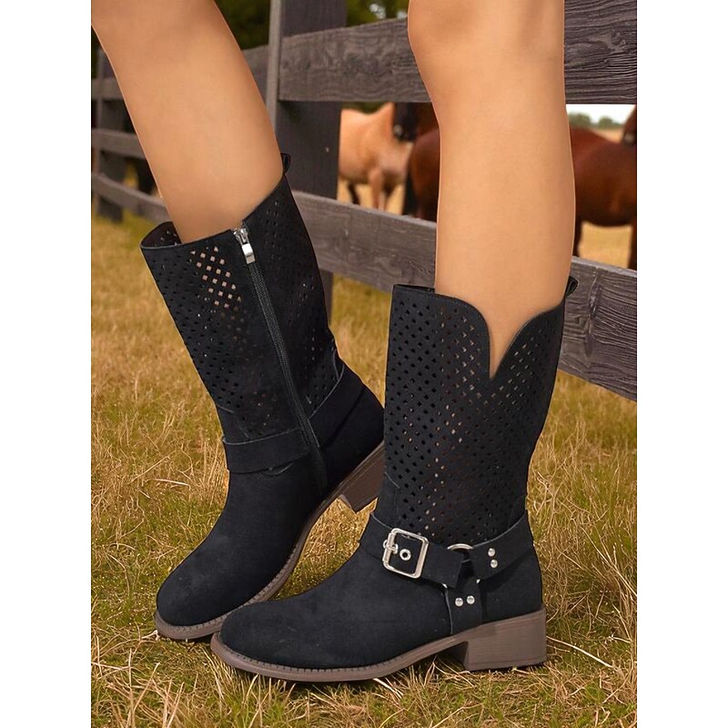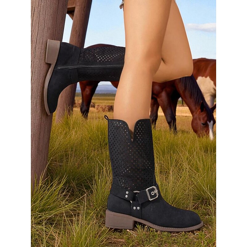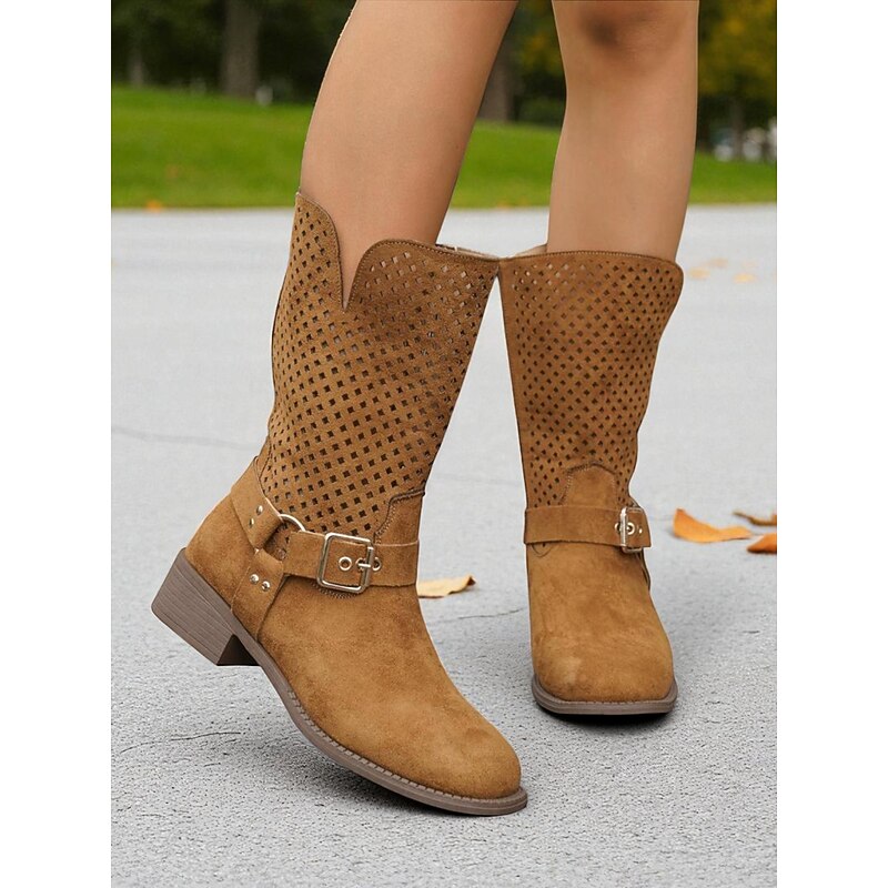 Why Choose Women's Brown Faux Suede Mid Calf Boots with Cutout Design and Buckle Strap – Casual Western Style Boots for Fall, Outdoor and Streetwear?