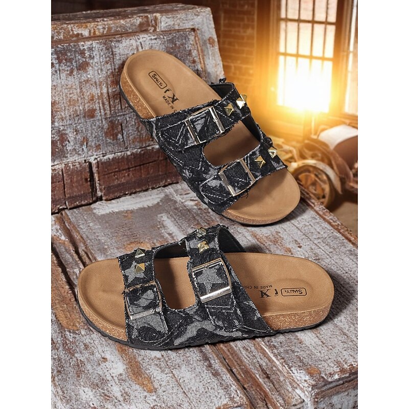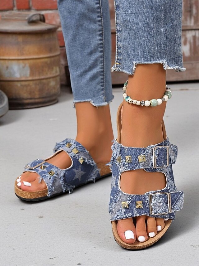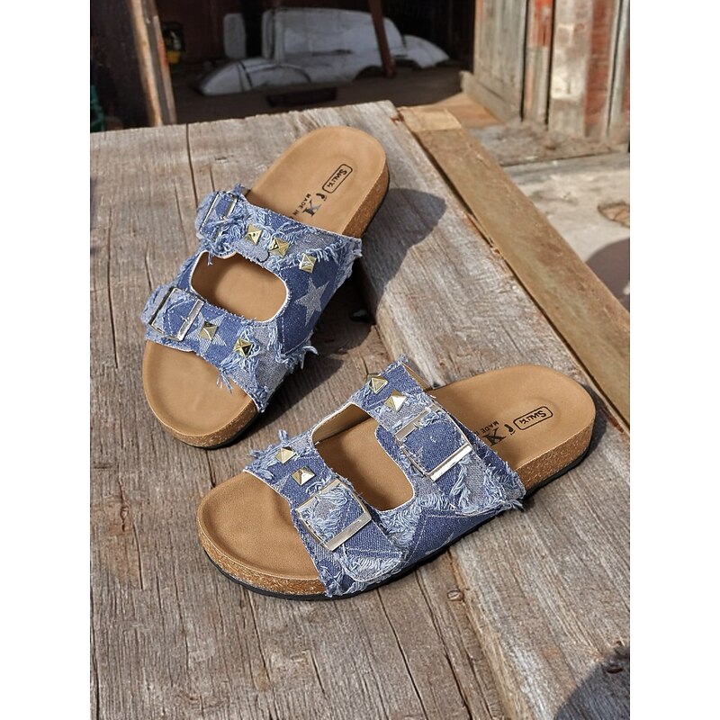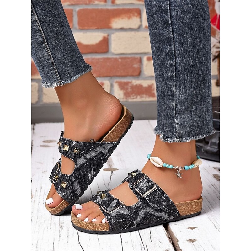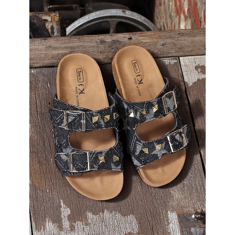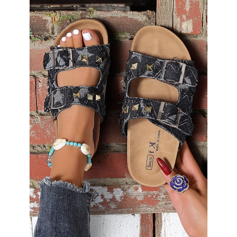 More information about Women's Denim Studded Double Buckle Sandals – Casual Streetwear Slides for Summer and Outdoor Activities