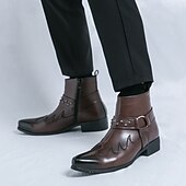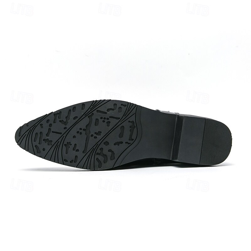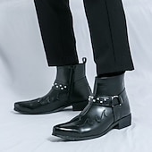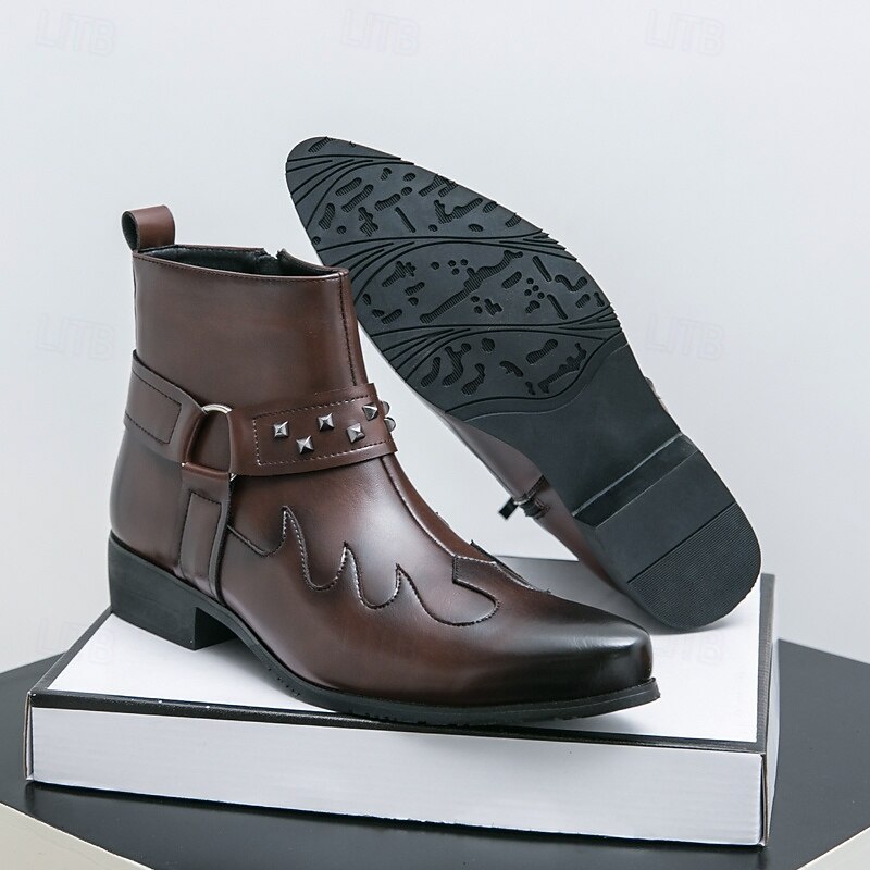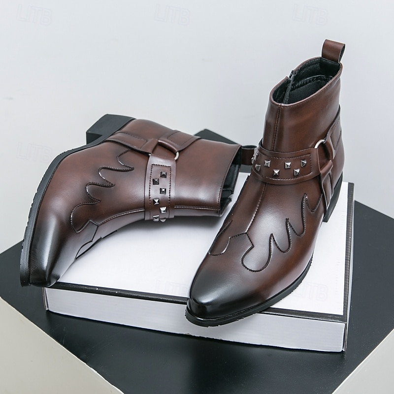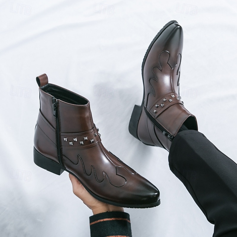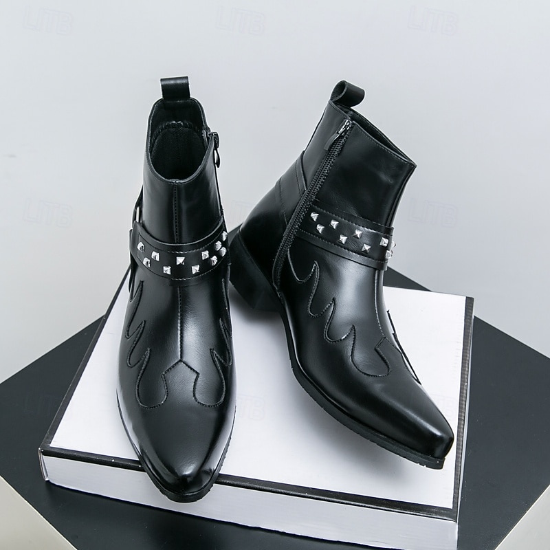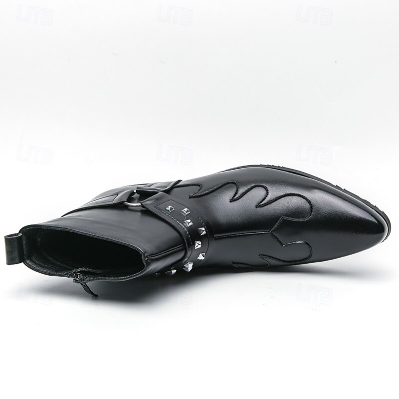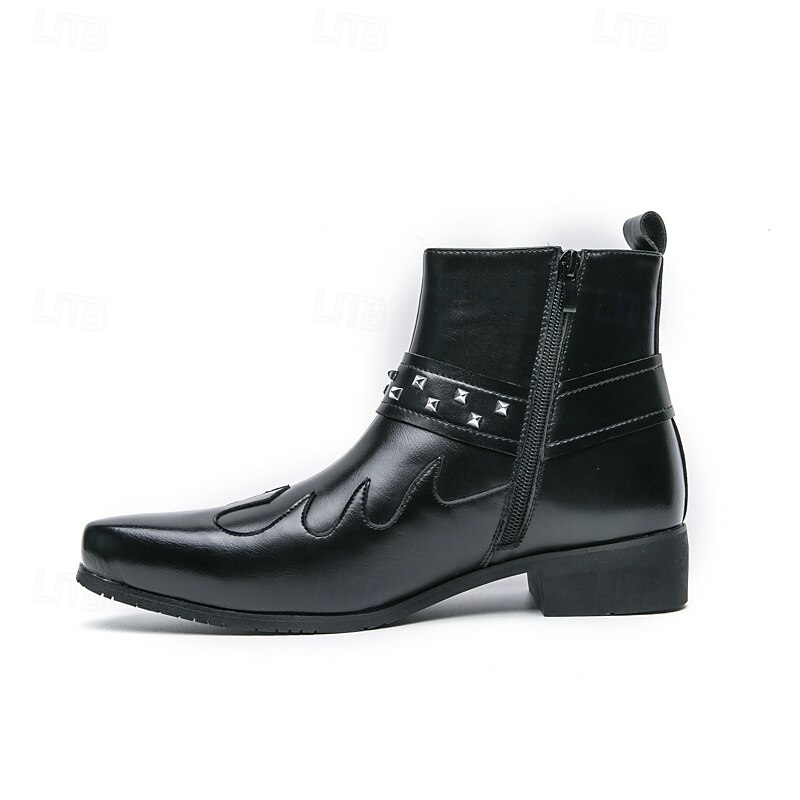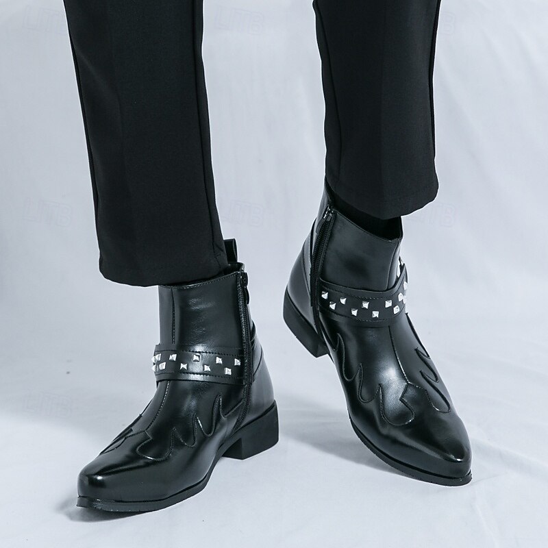 Highlights [Fabric] : Crafted from high-quality PU leather, these men's ankle boots boast a sleek, polished appearance and durable construction. The black faux leather provides a versatile and sophisticated base, while the interior features soft PU lining for added comfort. [Style] : The boots feature a classic yet contemporary silhouette with a round toe, offering a blend of timeless style and modern flair. This shape ensures a comfortable fit while maintaining a modern look suitable for various occasions. [Design Highlights] : These standout ankle boots include a decorative strap adorned with metallic studs, adding an edgy, fashion-forward element. The unique embroidery combined with a wave-like detail on the upper sets these boots apart. A sturdy low block heel offers stability and comfort, and the side zipper ensures easy on and off. [Occasions] : Perfect for a range of settings from casual outings to night out events, these boots seamlessly transition from day to evening wear. Their versatile style pairs well with both casual and more polished outfits, making them an essential choice for any fashion-conscious wardrobe. [Size Range] : Available in a wide range of sizes from US7 (EU39) to US11 (EU44), ensuring a suitable fit for various foot sizes and providing diverse options for your selection. Perfect for everyday use. supreme materials and excellent craftsmanship ensure long-lasting durability.