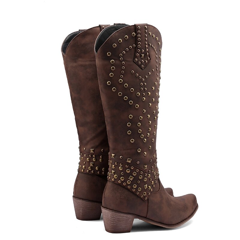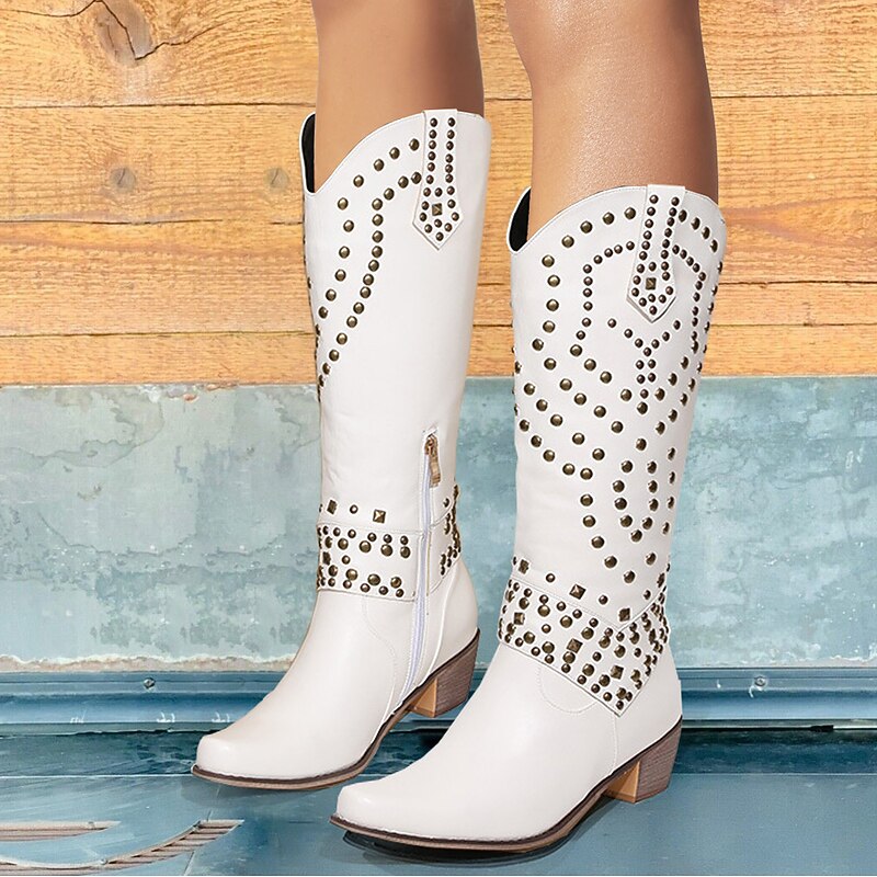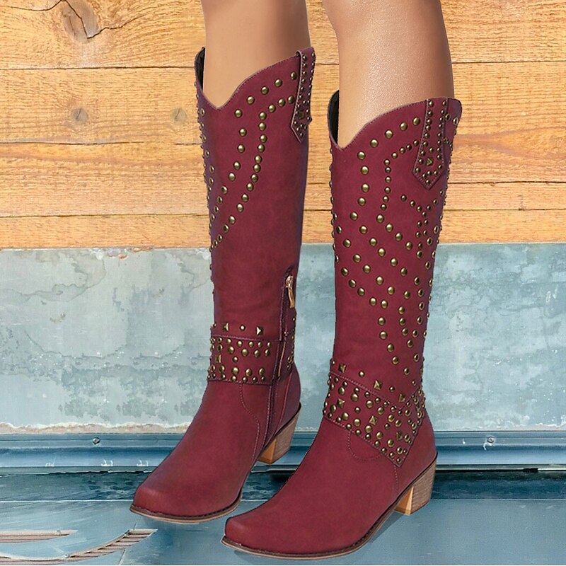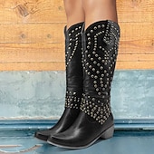 Women's Black Studded Faux Leather Knee-High Boots with Block Heels - Western Style Fashion Footwear for Fall and Winter