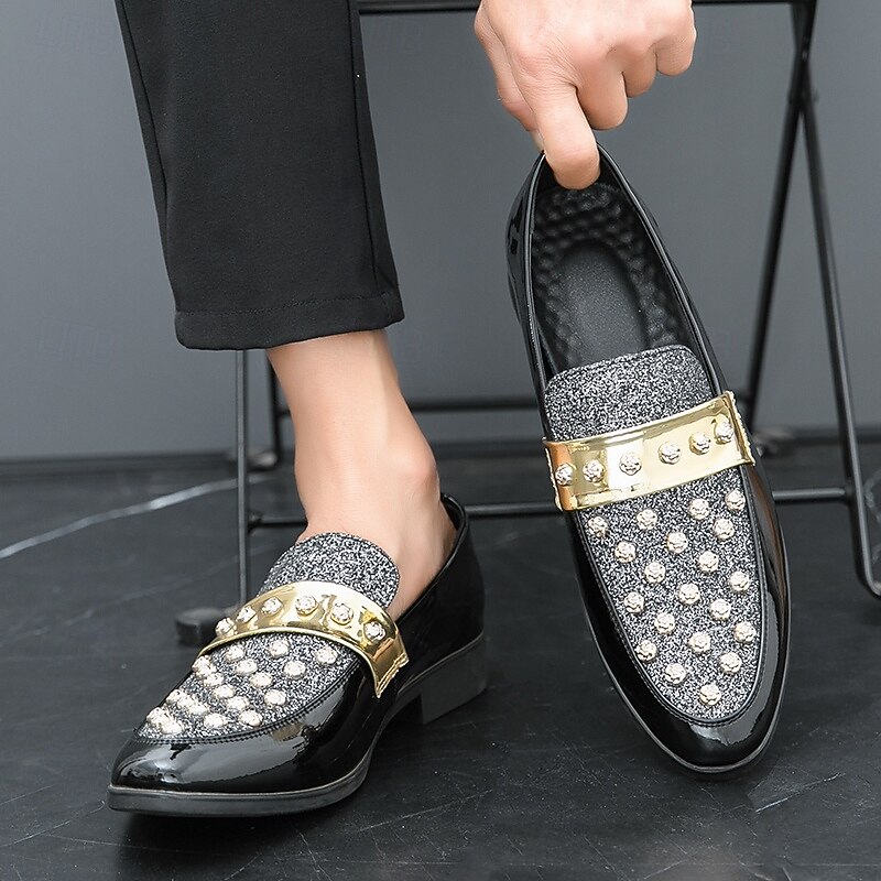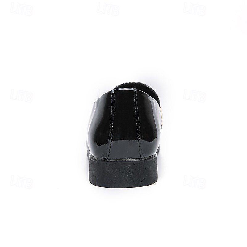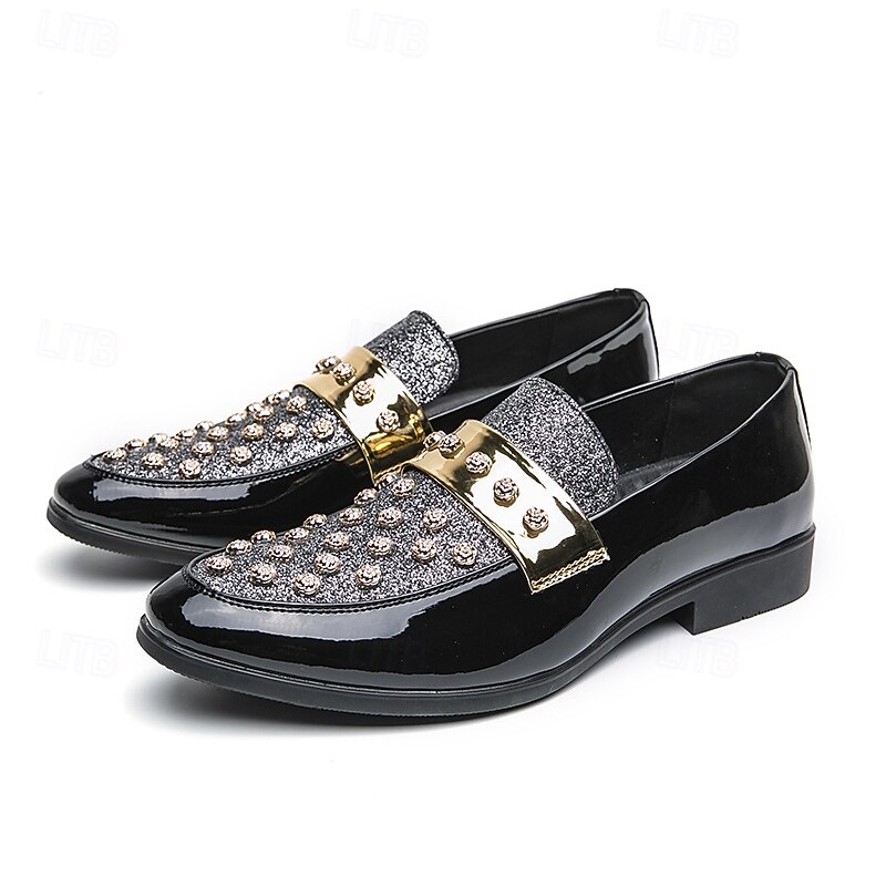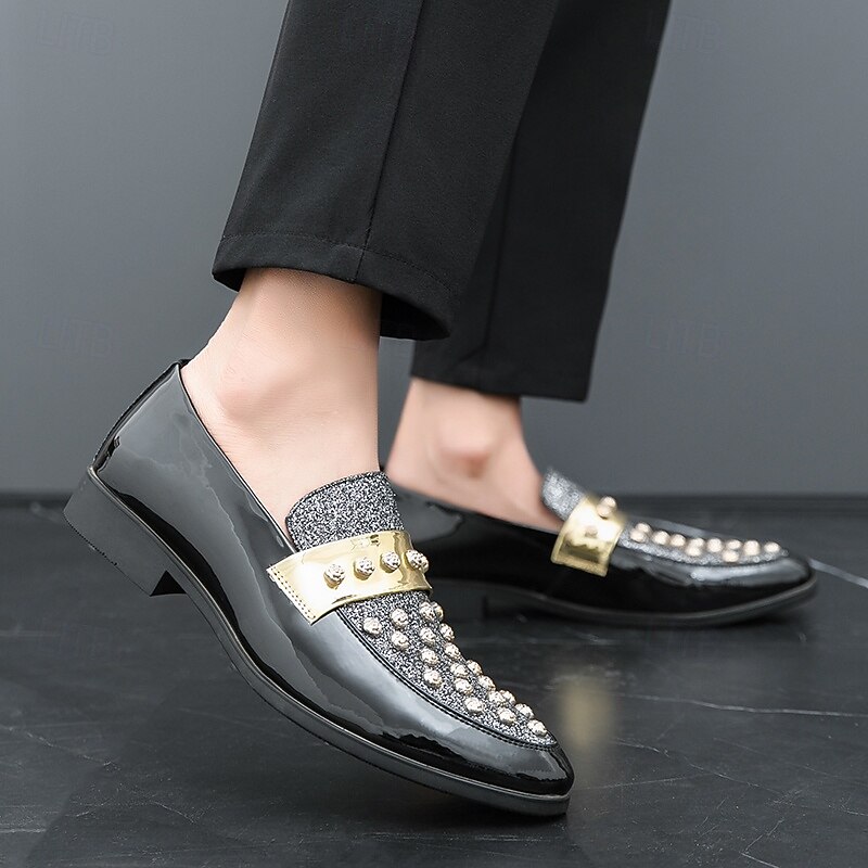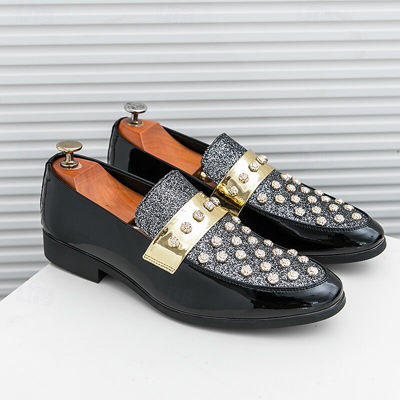 Why Choose Men's Black Patent Loafers with Studded Detail and Gold Strap, Fashionable Casual Shoes for Parties and Special Events?