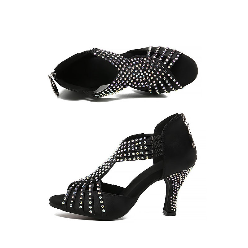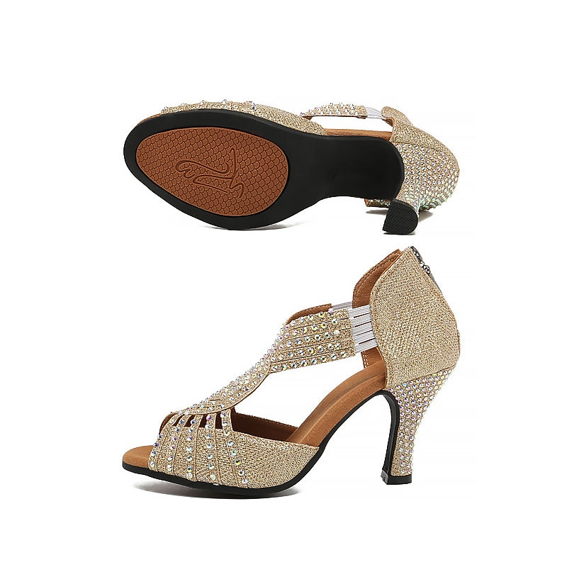 Highlights [Title] Women's Latin Dance Shoes - Fashionable Party Collection with Rhinestone Details [Fabric] Crafted with a sleek synthetic upper and tender fabric lining, these shoes offer a luxurious feel and ensure lasting comfort for extended wear during dance events. [Silhouette] These striking shoes feature a sophisticated flared heel design that provides both style and stability. With an open-toe shape, they deliver elegance and allow for breathability, perfect for extended wear on the dance floor. [Design Highlights] The sandals are embellished with sparkling rhinestones that add a touch of glamour and luxury, while the chic cut-out design enhances their contemporary appeal. The convenient back zipper ensures easy wearing and removal, contributing to their practical elegance. [Occasions] These shoes are ideal for ballroom and square dance events, as well as parties and fashion evenings. Their eye-catching design makes them a perfect choice for anyone aiming to leave a lasting impression at formal gatherings. [Size Range] Available in sizes 36 to 41, the shoes are designed to fit standard size selections, ensuring you can choose your usual size with confidence for an optimal fit.