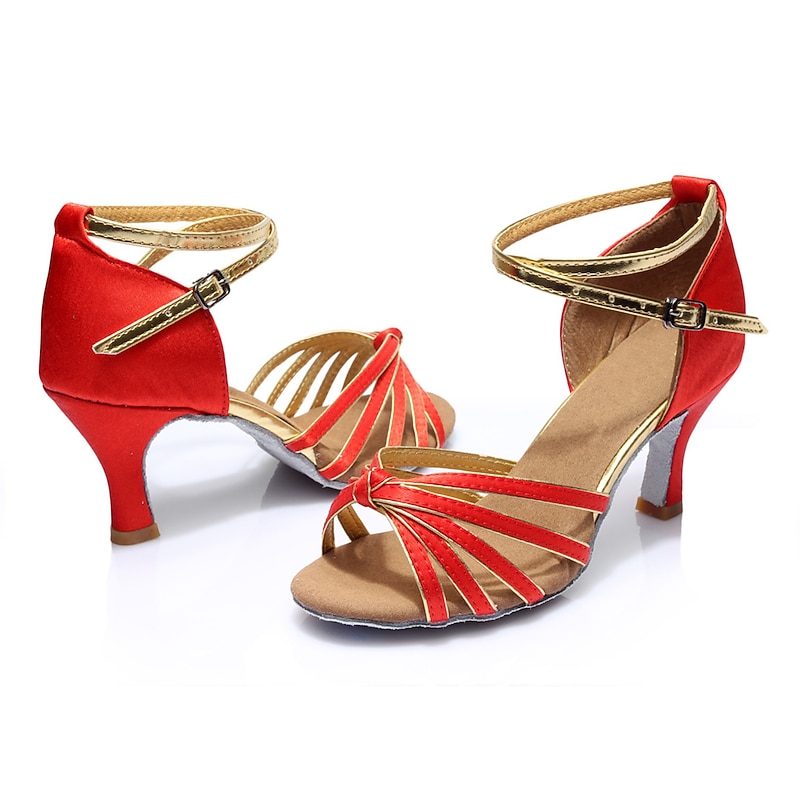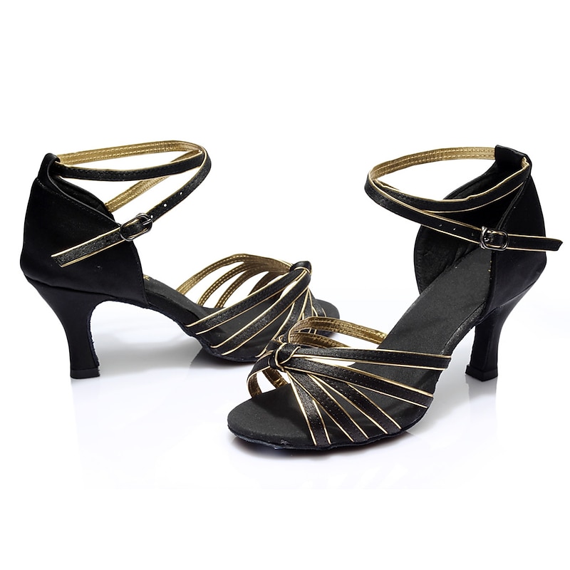Highlights [Fabric] Crafted from shiny satin and durable PU leather, these women's Latin dance shoes provide a soft, luxurious feel with the flexibility needed for fluid dance movements. The suede outsole ensures excellent grip and floor contact, enhancing performance. [Style] With a chic sandal design, these dance shoes feature a sophisticated open-toe and multiple slim, crisscross straps across the front. The moderately high 2 ¾ inch Cuban heel offers a graceful lift, perfect for both elegant and dynamic dance routines. [Design Highlights] The bold leopard embellishment and metallic buckle on the adjustable ankle strap add a touch of flair and security, making these shoes both sophisticated and functional. The shoes are customizable, allowing you to choose the perfect combination of colors and materials to match your dance attire. [Occasions] Ideal for indoor settings, these dance shoes are suitable for a variety of dance genres, including Latin, ballroom, salsa, and line dance. Whether for casual practice sessions or professional dance events, they blend comfort with elegance seamlessly. [Size Range] Available in an extensive size range, catering to various preferences and ensuring a comfortable, precise fit for every dancer. Select the best size for your performance needs from US5.5 to US9. Perfect for everyday use. excellent materials and excellent craftsmanship ensure long-lasting durability.
