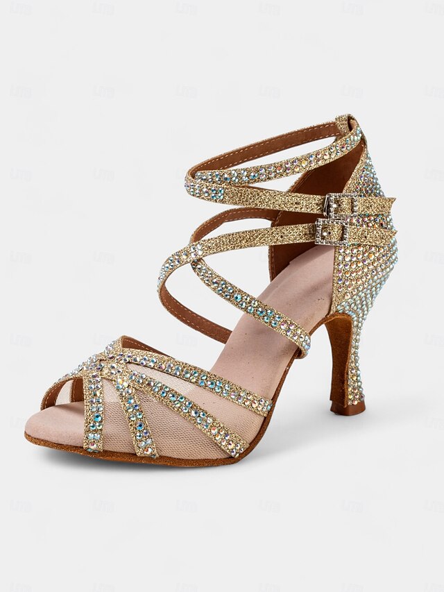 More information about Gold Rhinestone Strappy Ballroom Dance Heels with Double Buckle Straps - Performance Shoes for Women