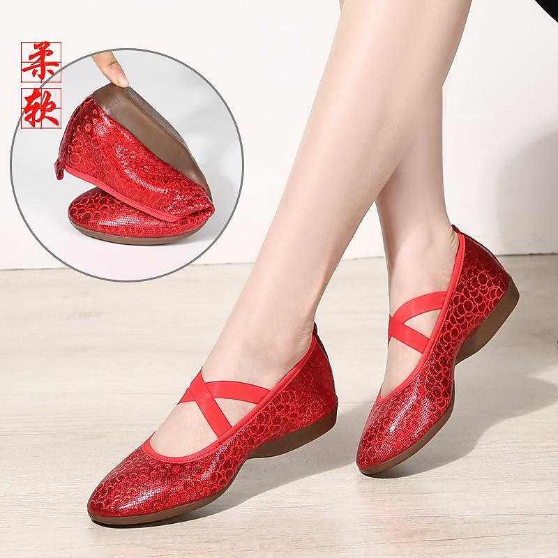 Highlights [Fabric] These women's dance shoes feature a shimmering leatherette upper, providing both style and durability. The material is lightweight and designed for comfort, allowing for graceful movement during various dance routines. [Fit] Designed with a flat heel, these shoes offer stability and ease of movement. The elastic band closure ensures a secure fit, making them ideal for extended wear during dance sessions or events. [Design Highlights] The shoes boast a classic rounded toe and a chic cross-strap detail, adding a touch of elegance and contemporary style. The intricate lace-like pattern on the metallic upper enhances their sparkling appearance, perfect for making a statement on the dance floor. [Occasions] Perfect for professional and outdoor dance events, these shoes are versatile enough for waltz, ballroom, modern dance, and contemporary dance occasions. Their elegant design also makes them suitable for parties and semi-formal gatherings, adding a glamorous touch to any outfit. [Size Range] Available in sizes ranging from 34 to 42, these shoes cater to a variety of foot sizes, ensuring comfort and style for all dancers. With a strong presence in 2024 sparkling shoe trends, they come in a selection of colors including gold, silver, and red. Perfect for everyday use. supreme materials and excellent craftsmanship ensure long-lasting durability.