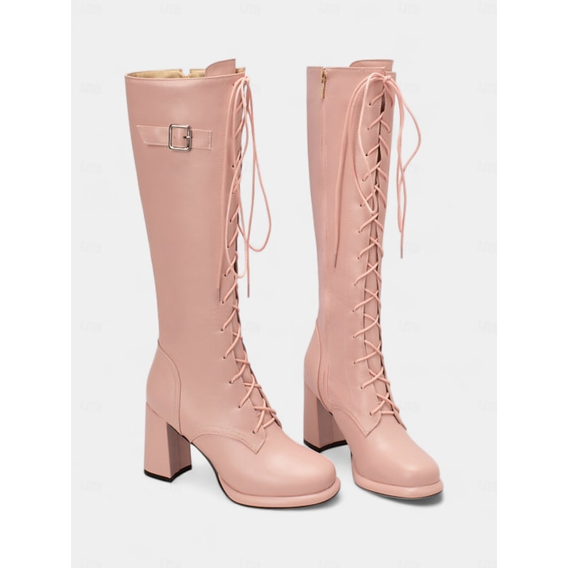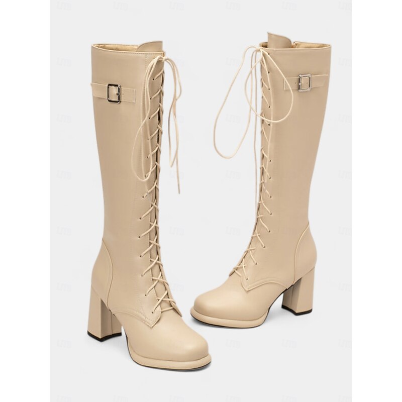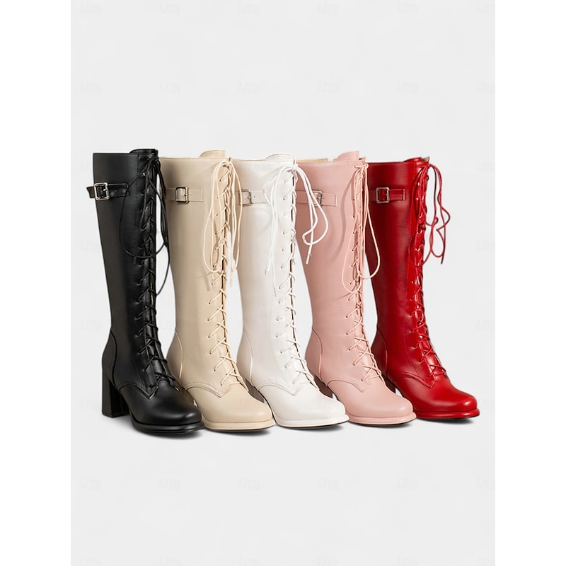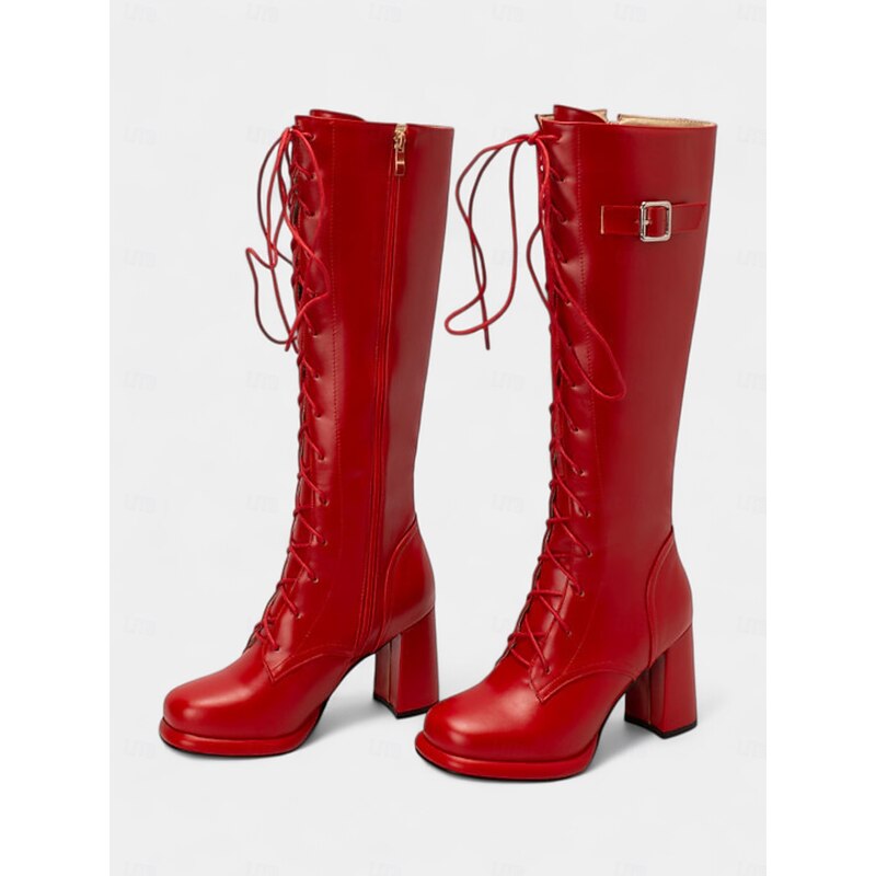 sizzling ! Women's Red Faux Leather Platform Knee-High Lace-Up Fashion Boots with Side Zipper - Chunky Heel Boots for Daily Outfits and Fall Winter Streetwear
