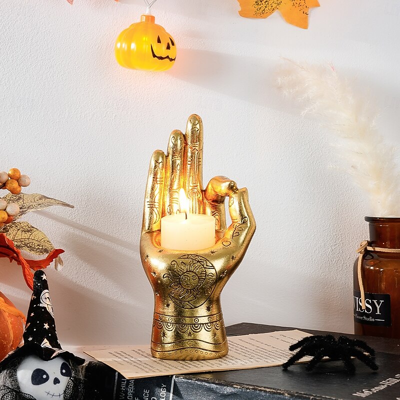 Why Choose Halloween Resin Right Hand Statue with Three-Finger Sun Pattern, Spooky Art Decor Candle Holder, Horror Design Element for Home Decor, Halloween Parties, and Day of the Dead Celebrations?