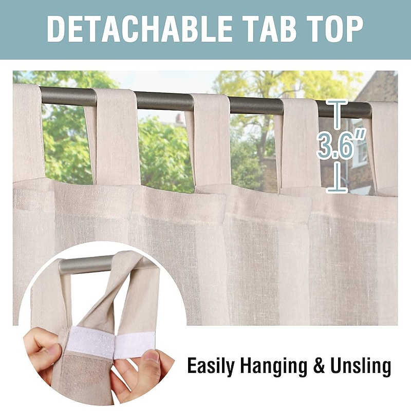 More information about Outdoor Linen Sheer Curtains for Patio Waterproof Indoor/Outdoor Divider Privacy Added Light Filtering Porch Decor with Detachable Self-Stick Tab Top for Gazebo/Cabana, Natural, 2 Panels