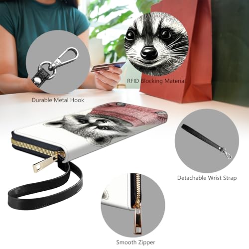 Womens Wallet, PU Leather RFID Cute Wristlet Wallets for Girls Women Ladies Purse Large Credit Card Clutch Purse Card Holder Coin Pocket Travel Wallets with Zipper, Art Cute Raccoon