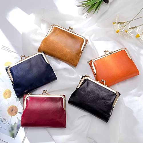 Small Kiss Lock Wallet: Vintage style classic and elegant bifold design for easy carrying with 4 card slots 2 receipt slots 2 cash compartments kiss-lock pocket and zipper pocket it is convenient to carry for both daily and travel.Genuine Leather Card Case: Made of soft first layer leather waterproof and easy to care for polyester lining delicate kiss lock smooth zipper stitching reinforcement ensure to provide you with comfortable and long-lasting use vintage genuine leather wallet is a daily stylish accessory.Everyday Card Wallet: The small wallet is structured to meet daily and travel needs with kiss-lock pockets for lipstick earphone cords cash zippered pockets for coins change 2 cash compartments for your cash or tickets and 4 card slots and 2 receipt slots for organizing your credit cards ID cards driver's license and receipts the reasonable structure keeps your items organized and easy to access.Small Clutch Purse: Compact and lightweight: (L) 5.1 x (W) 1.2 x (H) 3.9 weight: 0.28lb. The compact and lightweight wallet can hold your essentials the bi-fold and slim design is also very convenient to carry it can be easily clutched in your hand also fits well in your handbag easy and comfortable to carry.Ideal Gift Choice: The vintage and compact kiss-lock wallet is not only practical but also adds flair to outfits and makes an elegant and charming gift for friends girlfriends family and colleagues on New Year's Day Valentine's Day Christmas Thanksgiving Easter and birthdays. Perfect for everyday use. excellent materials and excellent craftsmanship ensure long-lasting durability.