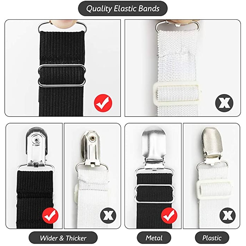 Highlights 【finest MATERIAL】: This Bed Sheet Fasteners are made of sturdy chrome metal clips and heavy duty elastic bungee cords that will grip your bed sheets firmly. Easy to put on and keeps sheets in place and no more fixing sheets, adjustable length allows desired tension. Triangle designs, which avoiding the elastic sliding all the time. 【ADJUSTABLE ELEASTICITY STARPS】: Wider elastic provides stable and stronger grip for heavy duty purpose; Easy to put on and keeps corners in place, Life savers! Perfect Fitted Bed Sheet and mattress Cover Fastening System. 【WIDE COMPATIBILITY】: This Fasteners can be used as tablecloths covers,grill covers, cars seat cover, boats seat cover, motorcycle seat cover, scooters seat cover, couch seat cover, chairs seat cover and more.