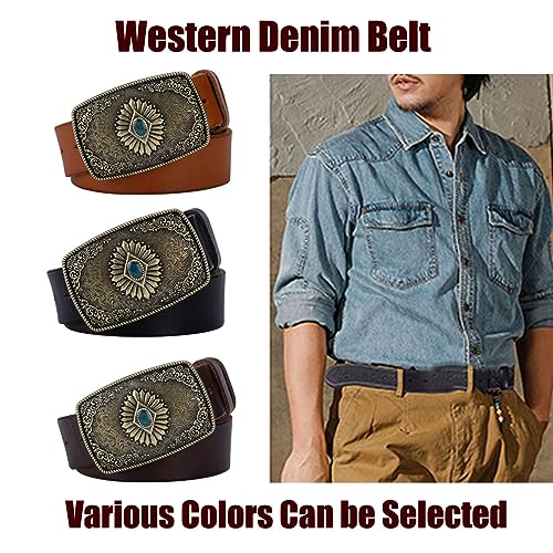 Western Cowboy Belt for Men, Men's Belt Leather, Bronze Pattern Vintage Belt with Turquoise Square Alloy Buckle