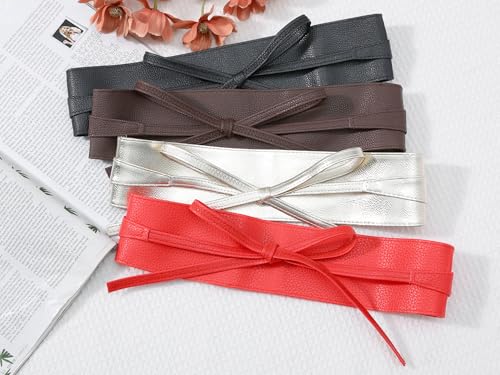 Fabric type: PU leatherCare instructions: Dry Cloth CleanOrigin: ImportedMaterial: This obi belt is made of PU leather, the soft leather fabric can closely fit your waist, the butterfly rope knot binding method adds design around the waist, and it can also be tied in different forms according to your own needs, comfortable wearing experience meets durable construction in this modern wide waistband.Color: Red, Black, Cream, Coffee, Navy Blue, Silver, Light Gold, Gold, Caramel. Solid color pattern, self-tying waist knot design, classic superb style, exquisite and delicate design, unique creativity, never out of date, so that you look more fashionable.Size: Total Length ( buckle included ): 223cm/87.8; Width: 7.8cm/3.1; Fit Waist Size: 80-100cm/31.5-39.4. In addition, please measure your waist size (including matching clothes) before you place your order.Wide Use: This soft belt works well with dresses, jeans, coats, blazers, mini skirts, sweaters, shirts, suits, and more. A stylish belt that highlights your waistline, enhances your outfit and gives your wardrobe a fresh look.Nice Gift: A good gift for a friend, mother, sister, daughter, wife, spouse, girlfriend, female colleague, etc. Suitable for Birthday, Mother's Day, Thanksgiving Day, Christmas, Valentine's Day, etc. Perfect for everyday use. premium materials and excellent craftsmanship ensure long-lasting durability.
