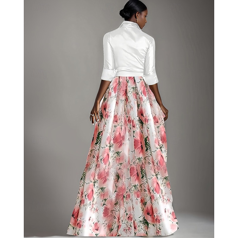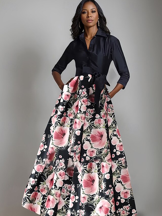 More information about A-Line Mother of the Bride Dress Floral Print Shirt Dress Elegant Bow Pleats Floor Length Shirt Collar Satin 3/4 Length Sleeve with Buttons Spring Summer