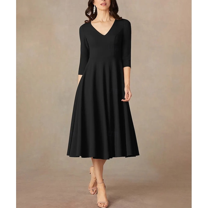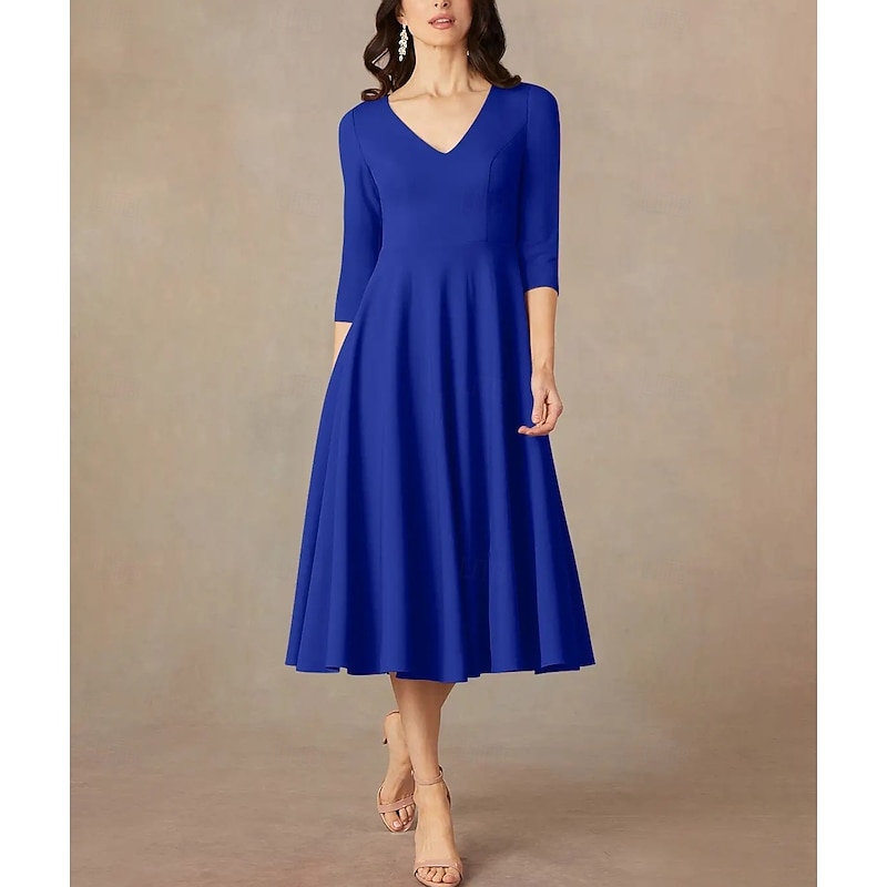 sizzling ! A-Line Mother of the Bride Dress Wedding Guest Elegant Minimalist V Neck Tea Length Italy Satin 3/4 Length Sleeve with Draping