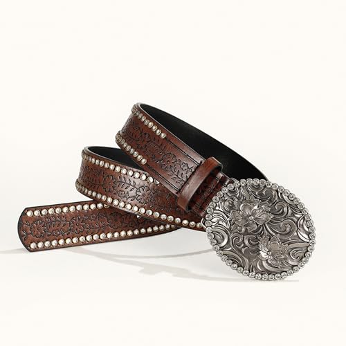 UTOWO Women Western-Cowboy-Belt with Diamond Flower-Buckle Rhinestone Cowgirl Belt Carved Pattern PU-Leather Belt for Jeans