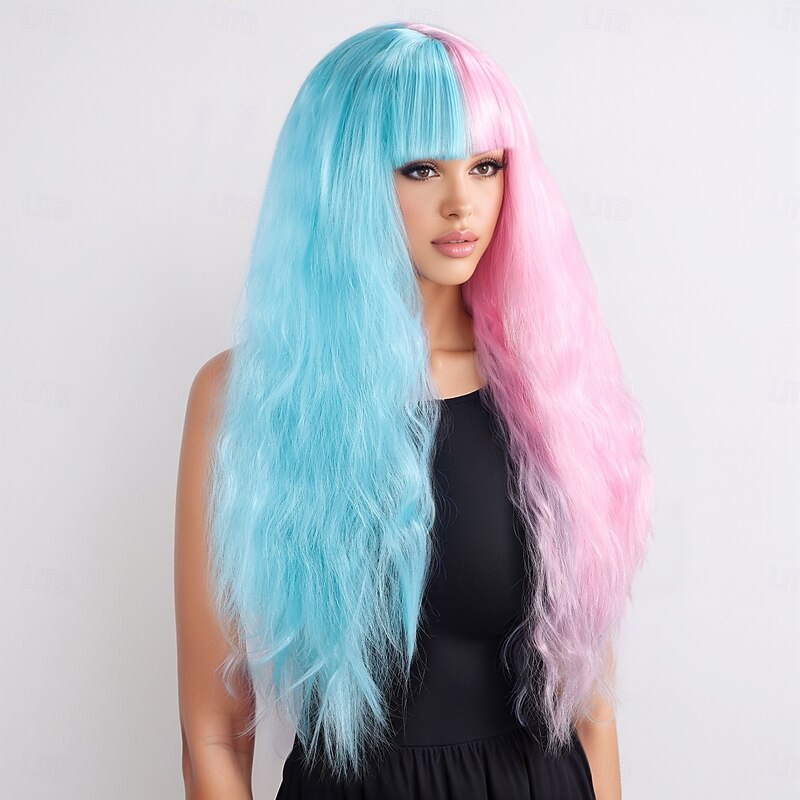 Why Choose Synthetic Wig Bouncy Curl Water Wave Layered Haircut With Bangs Machine Made Wig 24 inch A1 Synthetic Hair Women's iconic pleasant Ombre Hair Pink Blue?