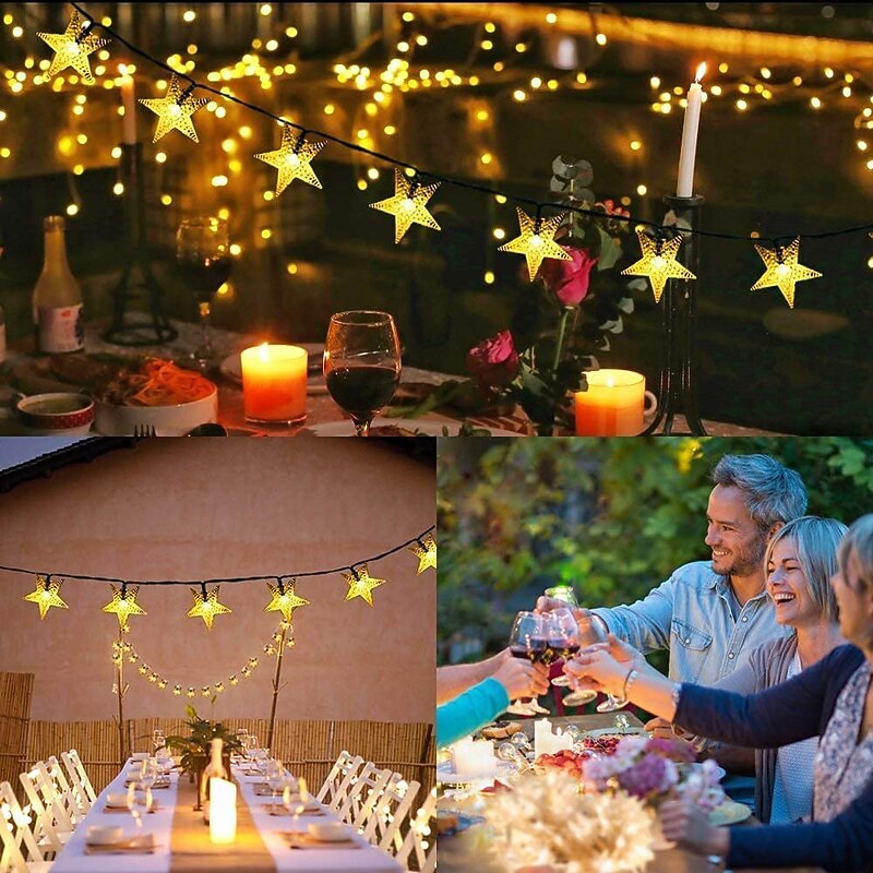 Highlights - Solar Powered LED Star Lights with upgraded panel for powerful and solid performance - No wires required, energy-saving design - Available in 16.5Ft/23Ft/39.5Ft lengths with 50LEDs for a nice heated smooth light that adds accent lighting to any outdoor space - 8 different lighting modes to suit your diverse needs - Auto ON/OFF feature with built-in light sensor for easy use - High efficiency solar panel and 600 mAh battery for up to 8-10 hours of working time after full charge - IP65 Waterproof design for outdoor use in various settings - Perfect for outdoor parties, Christmas, Ramadan, weddings, and home decor enhancements.