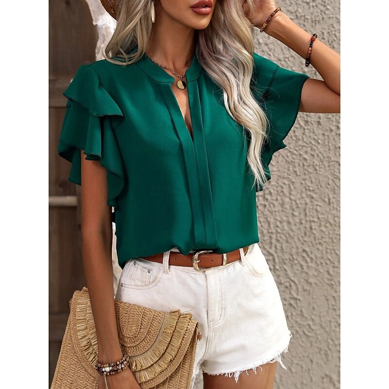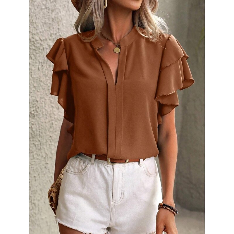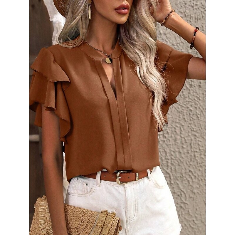 This Women's Shirt Blouse Solid Color Elegant modern Casual Short Sleeve Notched Neck Regular Tops Daily Ruffle Brown Green Summer Spring combines elegant design with practical functionality. Every detail has been carefully considered to ensure you get the best possible experience. The finest construction means this product will serve you well for years to come.