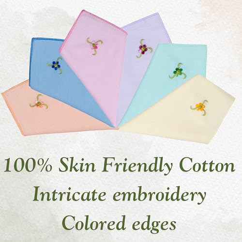 • Set of 12 Handkerchiefs - Including 12 women's handkerchiefs with 6 assorted color. Floral embroidery and special embroidered edges , 2 handkerchiefs in each color
