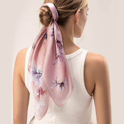 • [27 inch Head Scarves] The pink silk scarf is 27x27" ( 68.5x 68.5cm) inches. The square silk scarf is not only can be used as a neck scarf, hair scarf or headscarf, but also can be used as headband, hand band and hair bandana. Tips: Measured by hand, there might be small measurement error of the size.