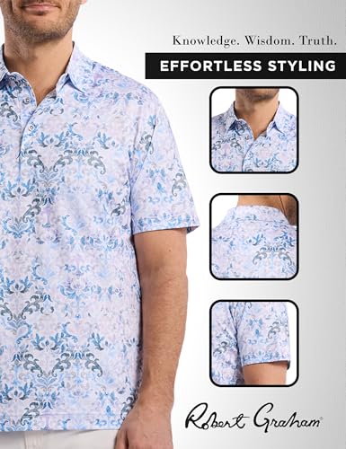 • VERSATILE MENS POLO: This trendy polo for men features ribbed details at the collar and sleeves and a damask-inspired print in soft blue and gray hues. Pair it with slacks or shorts to create a present-day statement.