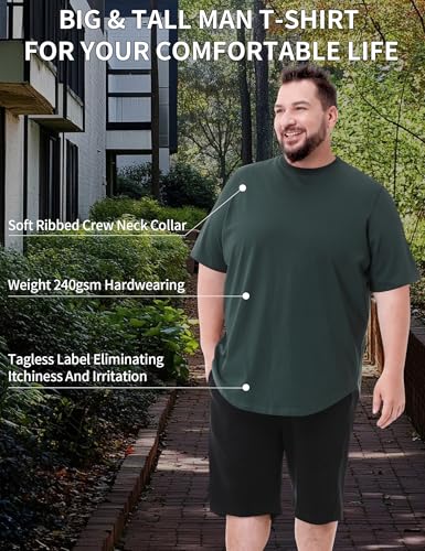 Fabric type: 50% Cotton, 50% PolyesterCare instructions: Machine WashOrigin: ImportedClosure type: Pull OnPERFECT FIT FOR EVERY HEIGHT: Specifically designed for bigger frames. Choose Regular Length (ideal for men under 6'2) or Tall Length (best for men 6'2 and taller) to ensure comfortable coverage without riding up.REMIUM HEAVYWEIGHT COMFORT: Crafted from a durable 240gsm (grams per square meter) 50% Cotton / 50% Polyester blend. Offers substantial feel, exceptional durability, and a soft, comfortable wear all day long.HARDWEARING & BREATHABLE: The high-quality fabric is built to last, resisting wear and tear while remaining highly breathable and comfortable, even in warmer weather. No sheer fabric β guaranteed opacity.COMFORT-CENTERED DESIGN: Features a soft ribbed crew neck collar for structure that won't choke, and a tagless label (heat transfer neck label) eliminating itchiness and irritation for sensitive skin.EASY CARE & LONG-LASTING SHAPE: Machine washable with confidence! Engineered to resist shrinking and maintain its shape wash after wash, preserving your perfect fit and investment. Perfect for everyday use. High quality materials and excellent craftsmanship ensure long-lasting durability.