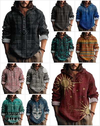 MARSVOVO Vintage Ethnic Men's Lightweight Hoodie Long Sleeve 3 Button Hooded Shirt Comfy Cool Daily Tops for Spring Fall
