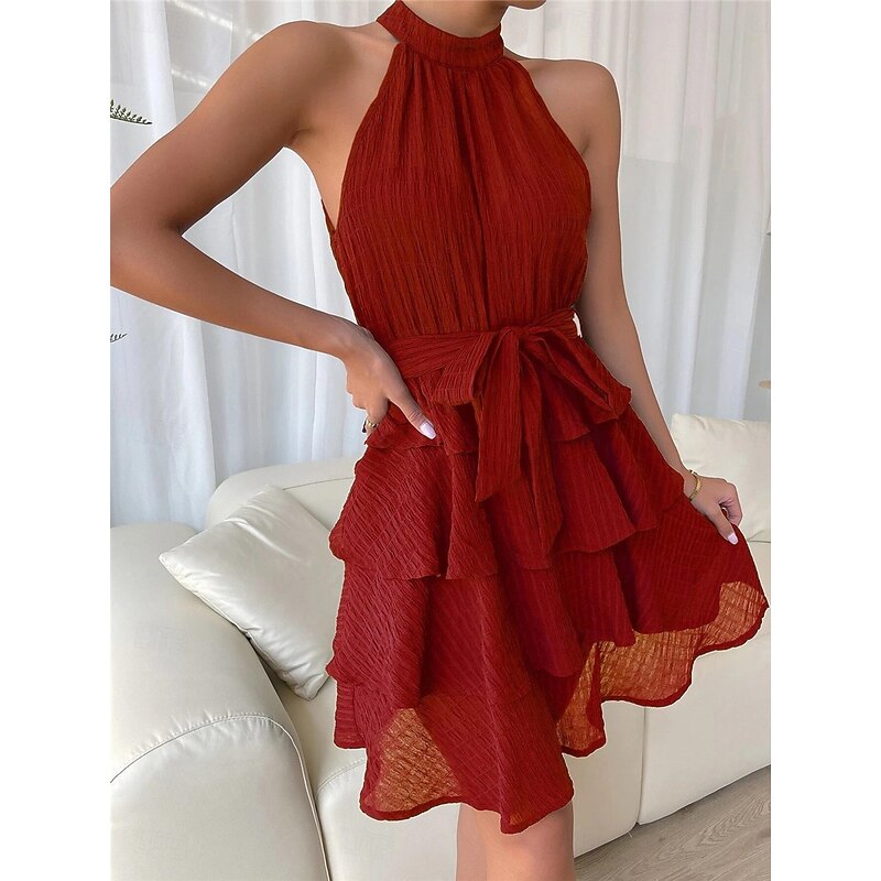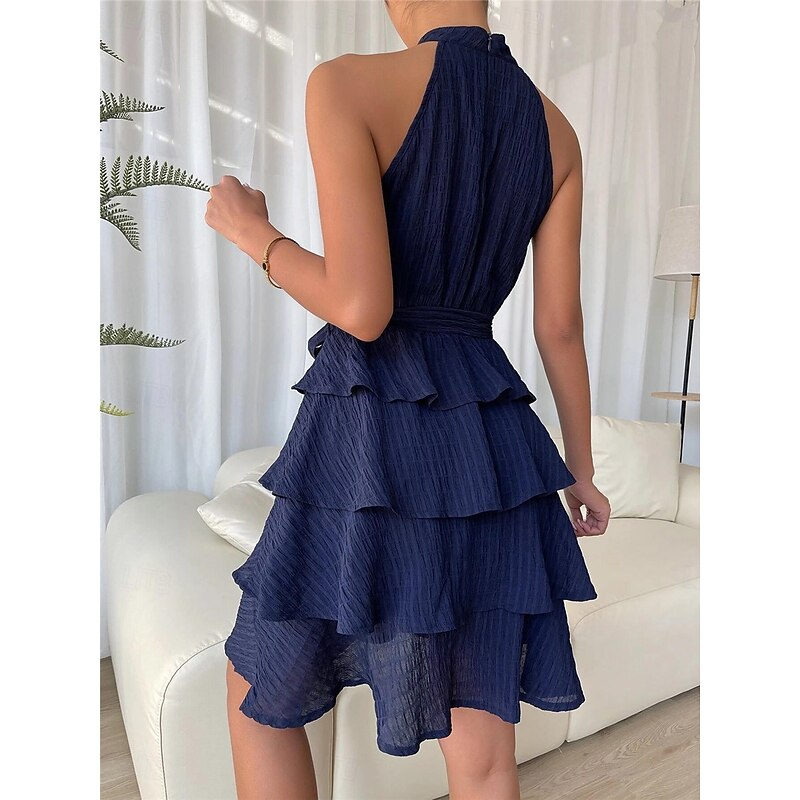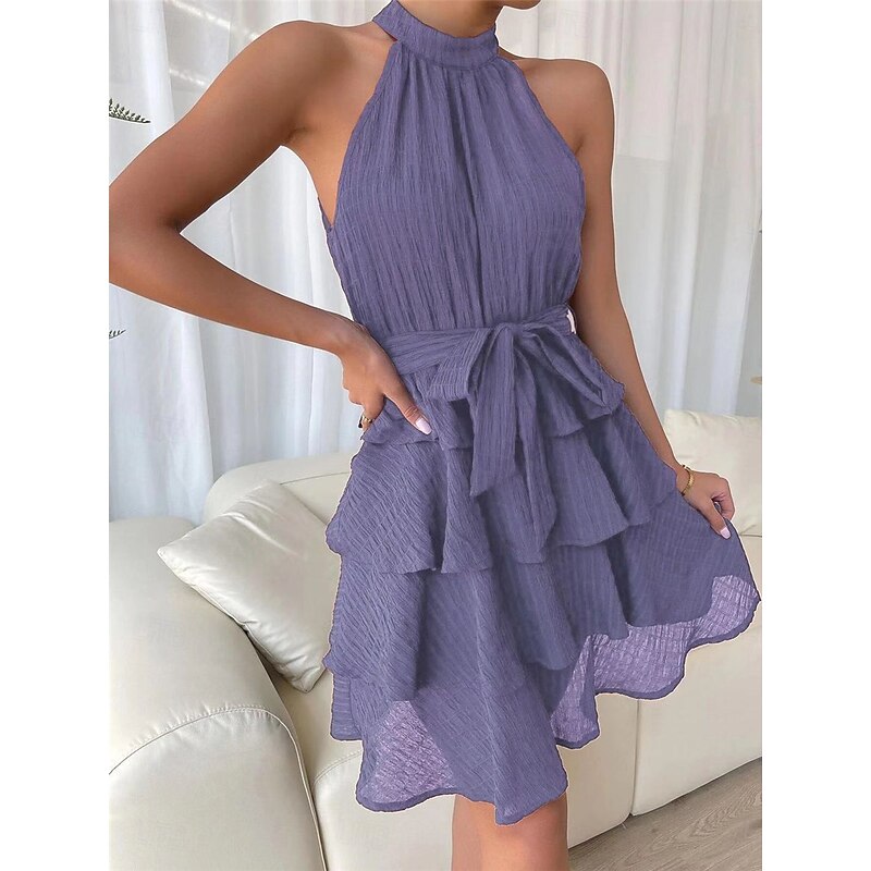 Highlights [Fabric] : Crafted from lightweight polyester, this dress is designed for ultimate comfort during the warm summer months. The micro-elastic fabric offers a subtle stretch, ensuring a comfortable fit while maintaining the dress's elegant shape. [Fit] : The dress features a regular fit that flatters various body types. The fitted waist, enhanced with a matching fabric belt, accentuates the hourglass silhouette, while the mini length provides a playful yet sophisticated look. [Design Highlights] : With a stylish halter neckline, this dress showcases your shoulders beautifully. The layered, ruffle design adds movement and texture, while the subtle crinkle texture of the fabric introduces visual interest and depth. [Occasions] : Perfect for a range of occasions, this versatile dress easily transitions from a casual streetwear piece to a striking outfit for dates, vacations, or holiday gatherings. Its effortless style makes it an ideal choice for summer events. [Size Range] : Available in sizes S, M, L, and XL, this dress offers a comfortable fit for a variety of body shapes, allowing you to find your perfect size for any occasion. With colors like Blue, Black, Red, and Purple, there's a shade to suit every preference. Perfect for everyday use. premium materials and excellent craftsmanship ensure long-lasting durability.