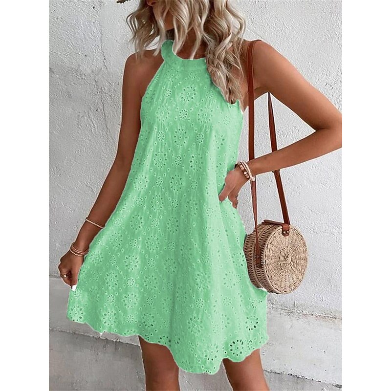 This mini dress shines with an intricate eyelet design, adding an elegant touch to its plain pattern. The halter neck adds a hint of sophistication, while the sleeveless style makes it a versatile choice for sunny days.
