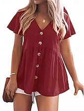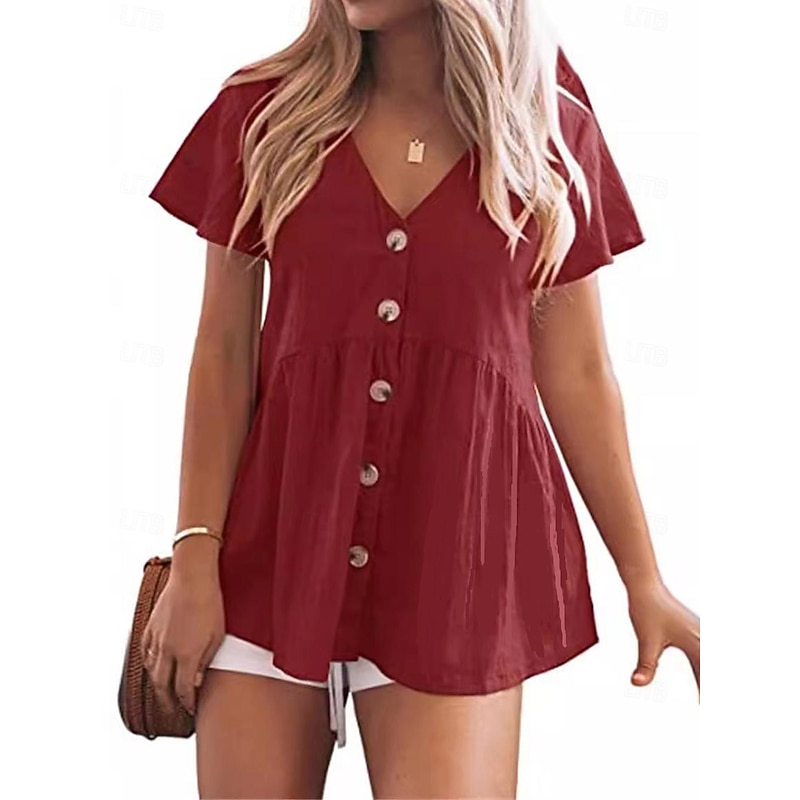 Highlights [Fabric] : Crafted from lightweight and breathable cotton, this women's blouse offers comfort and ease, perfect for warm weather wear. The fabric ensures a cool and airy feel, making it ideal for daily activities. [Fit] : Featuring a regular fit with micro-elasticity, the blouse offers a flattering silhouette with its relaxed, short-sleeve design. The V-neckline adds a touch of elegance, making it suitable for both casual and dressy occasions. [Design Highlights] : The blouse includes a modern row of buttons down the front, adding detail and sophistication. The flared hemline enhances the feminine silhouette, offering versatility when paired with shorts, jeans, or skirts. [Occasions] : This blouse is perfect for street wear and daily activities, whether you're heading to a casual outing or running errands. Its versatile style makes it suitable for various daily events. [Size Range] : Available in a wide range of sizes from S to XXL, ensuring a suitable fit for diverse body types and preferences. Choose from a variety of colors including Black, Red, Pink, and Gray to suit your personal style. Perfect for everyday use. premium materials and excellent craftsmanship ensure long-lasting durability.