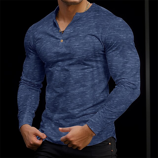 The shirt features a classic Henley neckline with button detailing, allowing for customizable comfort and style. Its plain pattern and heathered texture contribute to a sophisticated yet understated look, suitable for a variety of occasions.