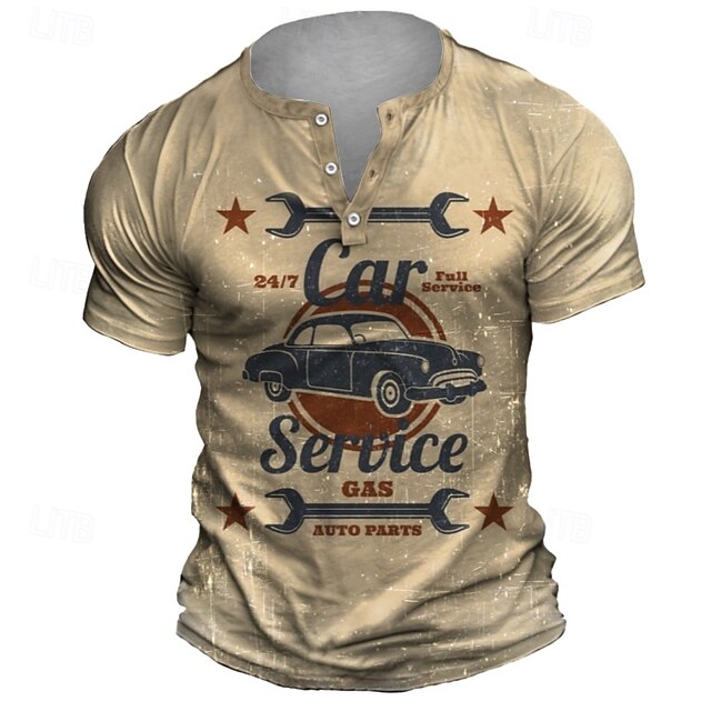 This Men's Graphic Car Service T shirt Henley Shirt Short Sleeve Retro Vintage Street Casual Daily Summer Spring Light Blue Khaki Gray Henley Henley T-Shirt combines elegant design with practical functionality. Every detail has been carefully considered to ensure you get the best possible experience. The magnificent construction means this product will serve you well for years to come.