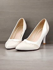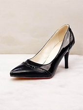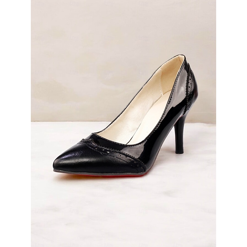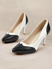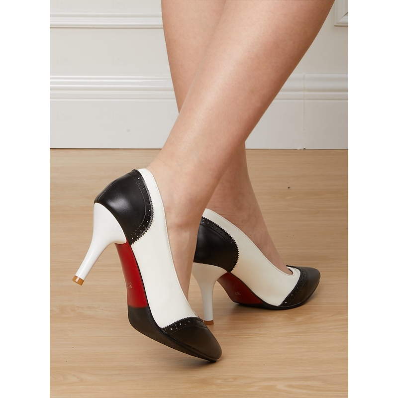 Highlights [Fabric] : Crafted from high-quality PU with synthetic leather lining, these pumps offer a smooth, polished appearance that mimics genuine leather without compromising on comfort or durability. [Fit] : Featuring a pointed toe design and medium stiletto heels, these shoes combine elegance with a comfortable fit, ideal for long wear without sacrificing style. [Design Highlights] : These black and white pumps feature a classic color-block design with intricate brogue-style detailing, capturing a vintage-inspired look perfect for the modern woman. The sleek pointed toe and sturdy rubber sole enhance the sophistication and practicality of these shoes. [Occasions] : Perfect for a variety of settings such as weddings, parties, workdays, and sophisticated daily outings, these elegant pumps are a versatile addition to any wardrobe, seamlessly transitioning from formal events to casual gatherings. [Size Range] : Available in a range of sizes from US 5.5 (EU 35) to US 10.5 (EU 42), these pumps are designed to fit true to size, ensuring that every woman can find her perfect match. Perfect for everyday use. excellent materials and excellent craftsmanship ensure long-lasting durability.