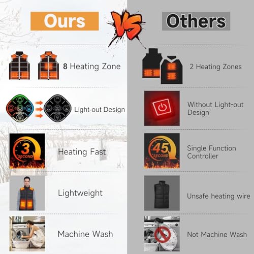Fabric type: 100% NylonCare instructions: Machine WashOrigin: ImportedUltra-Slim Carbon Fiber Heating Elements: Our men's heated vest features 8 ultra-slim carbon fiber heating elements that quickly generate even and continuous heat at the neck, shoulders, abdomen (under two pockets), back, and waist. This ensures your body core and hands stay warm and comfortable without wearing heavy clothes.Upgraded 5-in-1 Smart Button : The rechargeable heated vest for men is equipped with a 5-in-1 smart Button. It offers 3 heating levels (149°F-131°F-113°F) and 3 independent control zones (neck and shoulders, abdomen, back and waist), allowing you to customize your warmth for any weather or environment. With simple one-touch operation, you can enjoy your unique warmth with our warming vest for men.Ultra-Slim and Lightweight Battery Pack : The men's heated vest comes with a battery pack that is ultra-slim and lightweight. It includes a 5V/2A, 10,000mAh battery with an indicator, weighing only 5.8 ounces. The battery provides 3-6.5hours of warmth without bulkiness. It features a USB Type-C port for charging your phone or other devices. and the LED display shows battery status. The comfortable battery bag adapts to all movements, with a durable L-shaped USB cable.modern and Comfortable Warming Experience : Our men heated vest combines warmth and fashion with its stylish, great for mobility. The electrci heating vest is thin and lightweight enough for you to wear under your winter coat outdoors. The vest features water resistant fabric and Quality cotton, to keep you warm, dry and protected. The chest pocket pocket and two zippered hand pockets help to keep important items and hands secure and warm. Double zipper design.Premium Support and Best Winter Gift : Choose the right size using the size chart, enjoy comprehensive customer care. This electric vest for men is ideal for cold indoor work, camping, hunting, skiing, golfing, and watching games. It makes a perfect gift for Christmas, Thanksgiving, Halloween, and birthdays for husband, boyfriend, or father. This heating vest is perfect for showing your concern for a family member working in a cold winter. Perfect for everyday use. premium materials and excellent craftsmanship ensure long-lasting durability.