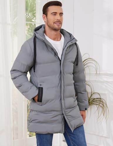 • Design: Mens winter long puffer jackets, solid color, hood with adjustable drawstrings and stand collar, full zipper closure, mid length, snap button on the cuffs and hood. With its exceptional design, this jacket effectively blocks out gusts of wind, ensuring that you stay protected and sheltered from chilly breezes.
