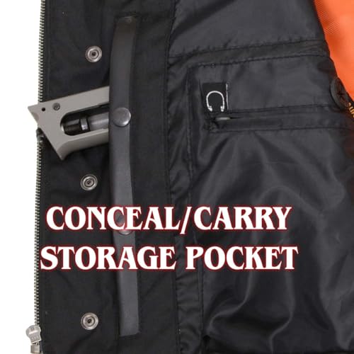 • ✅ Pockets | This biker vest is designed with concealed and carry 2 pockets (can be used as regular storage pockets). It features strategically placed pockets with secure closures, allowing you to discreetly carry while maintaining a sleek and contemporary look. Our vest includes 2 front chest pockets w/ flaps, 2 outside lower slit drop handwarmer pockets with concealed snap, 1 inside media pocket for phone, 1 extra inside zipper pocket.
