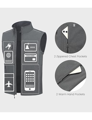 95% Polyester, 5% ElastaneImportedWarm Up & Full-zip Golf Vest ---- Comfortable soft fleeced liner and full zip construction keep you warm and dry even in a lightly drizzles or a slightly chilly day. Windproof and tear-resistant outer fabric offers a strong protection from wind and daily wearWindproof & Lightweight ---- Stand neck collar with a wind guard under the zipper and the adjustable elastic drawstring at the hem helps to fit better and seal out the elements as a windbreaker. 3-layered compounding technology but lightweight shell fabric make it durable without being too baggy so that you can wear it out as socially cloth as well as a sportswearSimple Design & Well Craft---- sophisticated jacket with a sleeveless design and elastic cuffs provide a full range of movement and keeps your arms moving freely. The heavy-duty and smooth zipper in the front makes it more convenient and comfortable to wear. Reinforced stitched seams for more durability and long-term performanceUtility Pockets ---- 2 large hand pockets and 1 front chest pocket provide enough space for you to store personal stuff and are easily accessible. All pockets also have zippers to secure your items safe and each zipper is stitched solidlyOutdoor Vest for Men ---- This men's vest is made of soft shell fabric which is smooth with a little stretch, wipes off easily and is washable. Resists abrasion and scratches, great for work and outdoor activities such as golf, running, jogging, hiking, fishing, climbing, cycling, traveling,workout and so on. Keeping you warm and comfortable Perfect for everyday use. excellent materials and excellent craftsmanship ensure long-lasting durability.