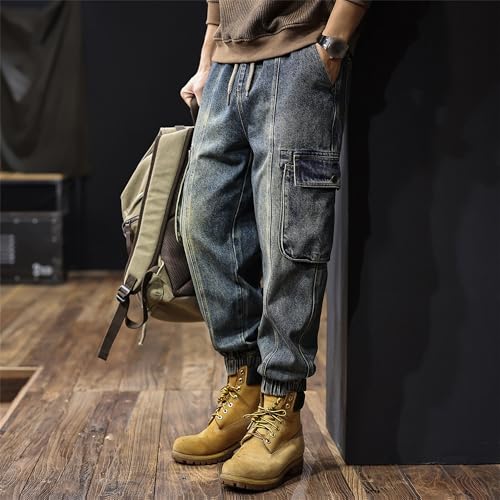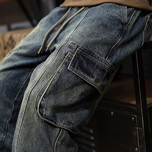 Cargo Jeans for Men Loose Fit Vintage Denim Jogger Blue Pants Streetwear Multi Pocket Work Pants