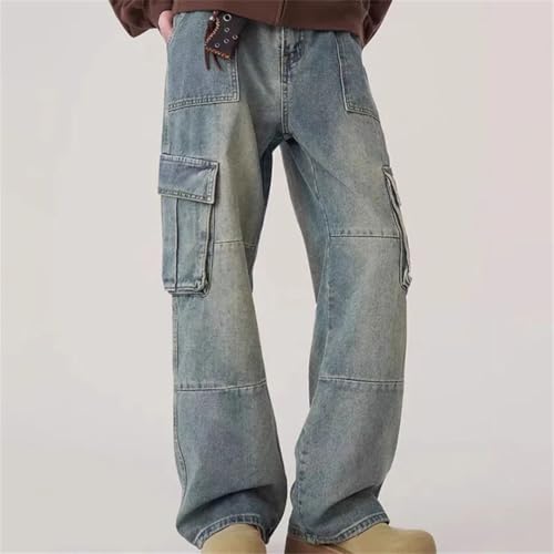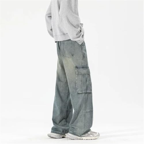 More information about Men Korean Version Leisure Baggy Straight Cargo Jeans Vintage Blue Multi Pocket Design Trousers