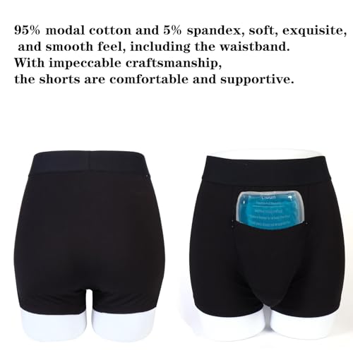 Care instructions: Machine WashOrigin: ImportedAre you in preparation for your upcoming surgery or have undergone a vasectomy surgery? This Vasectomy Support Underwear is detailed specifically for you Thoughtfully designed is clearly well-thought-out, catering specifically to those undergoing or recovering from a vasectomy. Its primary aim is to alleviate pain and facilitate a quicker return to daily activities.One of the standout features of this underwear is its comfort. The loose design ensures minimal pressure on the scr, providing a degree of comfort suitable for daily wear. This makes the transition into the recovery period smoother and less daunting. For anyone prepping for a vasectomy, I would absolutely recommend considering this underwear as a part of your recovery toolkit.95% modal cotton and 5% spandex, soft, exquisite, and smooth feel, including the waistband. With impeccable craftsmanship, the shorts are cushy and supportive. Strategically located in the front pouch is a gel pack which provides relief over a larger area and assists in reducing post-operative swelling through cold therapy. These shorts are not only beneficial for post-surgery use, but also ideal for summer wear, contributing to maintaining a cool and healthy exterior.a zippered pocket, included gel pack. The two gel packs can be perfectly cooled and swapped out as needed throughout the day. The pocket is designed to match the contours of the gel packs for a snug fit, providing full coverage to the surgical area. The gel ice pack is well crafted, capable of being frozen or heated, while maintaining its flexibility. The pocket with the zippered design can also hold other items, such as money, cards, keys, etc., helping loss. Perfect for everyday use. premium materials and excellent craftsmanship ensure long-lasting durability.