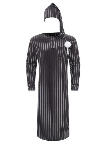 More information about Men's 2Pcs Night Shirts Loose Robe Long Sleeve Striped Nightgown Sleepwear with Hat