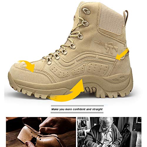 Origin: ImportedSole material: RubberOuter material: Leather and RubberClosure type: Zipper/Laces【MATERIAL】: this men’s combat boots upper made of suede leather and quality breathable mesh, durable and scratch-resistant. Toe cap with suede leather molded in one, anti-kick and anti-collision, effectively against outer shock. All terrain outsole, great grip with pattern design, non-slip and wear-resistant. EVA midsole, ultralight and flexible, supply excellent cushioning, reducing fatigue when wearing. Extremely comfortable and breathable in summer heat when hiking, motorcycle, work, etc【LIGHTWEIGHT & BREATHABLE】: This military boots for men weigh approx 2.4 lb / 38.4 ounce. Won’t feel heavy and fatigue when wearing it, able to put leg opening into boots, very convenient tactical combat boots. Keeps feet dry with vented holes in the side to aid in ventilation and drainage of moisture, better to deal with summer heat. Ankle part made of Cordura fabric, thin but durable, make this lightweight work boots super ventilation【FIT & COMFORTABLE】: retro jungle boots with US size, fit !!!Please confirm your Foot Length with our size chart to make sure perfect fit before choosing size. Whether in desert, climbing or in duty work, you’ll need this military combat boots to provide you maximum comfort and long lasting. Durable, lightweight, breathable, strong grip and protective, all in one【TACTICAL】: Tactical design with urban fashion style, make this military men boots practical to outdoor and city life. Shoes with ergonomic design and protect your ankle.Good ventilation and comfortable wearing shoes that against slide on various of terrains. Durable lace, fast take on and off. Gusseted tongue that prevents dirt, pebbles and sand from entering this tactical shoes for men.【SEASON】 and serviceDesigned for Spring Summer Autumn and Winter, especially for hot weathers. Offers all day comfort for those who love outdoor and live for adventure. A lighter style of hiking, walking and sports shoes. If you are looking for premium construction, lightweight, comfortable wearing and good-looking boots, then here it is. Perfect for everyday use. High quality materials and excellent craftsmanship ensure long-lasting durability.