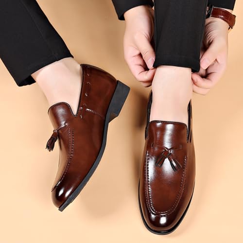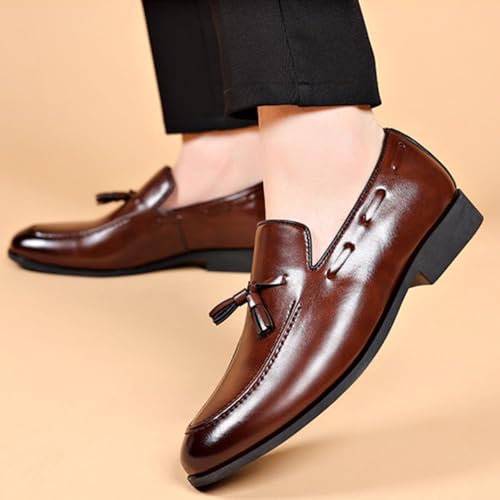 Sole material: RubberOuter material: LeatherClosure type: Pull-OnWater resistance level: Not Water Resistant1. [Premium Leather & Timeless Design];---Crafted from high-quality leather, these tassel loafers offer a sophisticated vintage look with a classic pointed toe and elegant silhouette. Perfect for business, weddings, or formal occasions, adding a touch of refined style to any outfit.2. [Comfortable Slip-On Design with Flexible Fit];---Designed for effortless wear, these penny loafers feature a slip-on style with a snug yet flexible fit, ensuring all-day comfort. The lightweight construction and breathable lining prevent fatigue, making them ideal for long events or office wear.3. [sophisticated Tassel & Penny Keeper Detail];---The handcrafted tassel decoration and penny keeper strap add a luxurious vintage touch, elevating your formal or business attire. A perfect blend of classic and modern fashion for men who appreciate refined details.4. [Versatile for Multiple Occasions];---From weddings and smoking parties to business meetings and casual Fridays, these loafers effortlessly transition between formal and smart-casual settings. Pair them with suits, chinos, or jeans for a polished look.5. [Durable Construction & Anti-Slip Sole];---Built for long-lasting wear, these dress shoes feature a sturdy leather sole with subtle traction for stability on smooth surfaces. The low heel ensures comfort while maintaining an elegant profile. Perfect for everyday use. excellent materials and excellent craftsmanship ensure long-lasting durability.