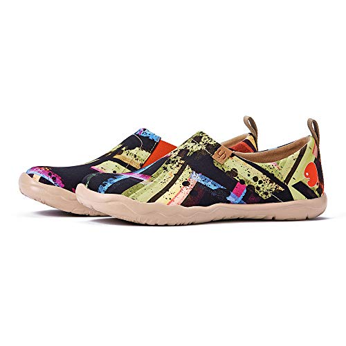Fabric type: CanvasSole material: Ethylene Vinyl AcetateOuter material: CanvasClosure type: Pull-OnU IN STORY: Paint your story, free your sole. UIN canvas shoes underline positive feelings related to traveling through colorful and artistic patterns.COMFORTABLE, EASY TO TAKE ON & OFF : No shoelaces and the high elastic band make it easy to take them on and off. The bionic design fits your feet comfortably while shoe lightweight saves your energy even after taking thousands of steps.ENVIRONMENTALLY FRIENDLY: UIN pays much effort to reduce negative impacts on the environment. Our materials are safe with environmentally-friendly features, limiting pollution to the ecosystem. None of UIN sneakers incorporates fur or other elements of animal origins.TAILORED FOR TRAVELERS AND ART ENTHUSIASTS: UIN Footwear's loafers are a testament to two passions โ travel and art. Many travelers and art enthusiasts also believe in such an enthusiastic, casual and fun approach towards fashion. UIN Flats are also perfect for daily use, applicable for attending school, driving, traveling, party, concert, and shopping.GIFTS FOR EVERYONE ON YOUR LIST:The beloved people in your life deserve the best on some special days. No matter if you're shopping for your wife, husband, girlfriend, boyfriend, mom, sister, friend, or kid, these unique painted shoes will help to express your love and catch the eyesight of others. Perfect for everyday use. High quality materials and excellent craftsmanship ensure long-lasting durability.